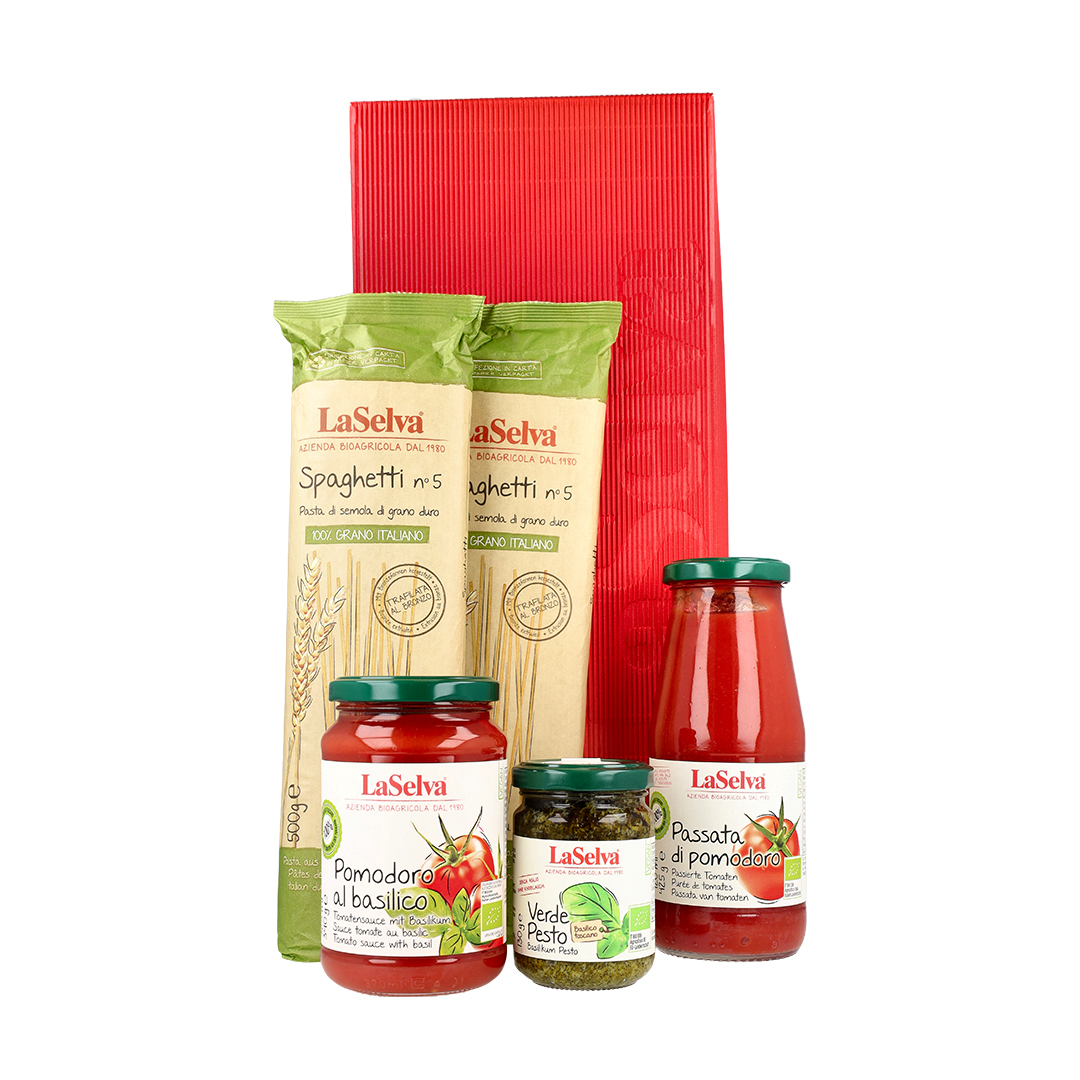 La Bio Box Essenziale contiene: 2 Spaghetti bio n°5 500g, 1 Verde Pesto 130g, 1 Passata di pomodoro bio 425g, 1 Pomodoro al basilico bio 340g. Prodotti biologici, versatili, con profumi e sapori che conquistano. Nella Bio Box Essenziale LaSelva ritrovi l’amore per l’agricoltura sostenibile e il desiderio di gustare vegetali di qualità, raccolti e trasformati nel momento in cui esprimono il massimo delle loro caratteristiche organolettiche.