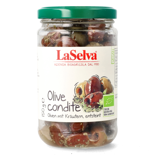 Abbiamo selezionato olive verdi e nere per avere diverse sfumature di sapore, le abbiamo denocciolate e le abbiamo condite con olio extra vergine d’oliva, aceto di vino, sale marino e tre piante aromatiche tipiche della macchia mediterranea: origano, timo, rosmarino. Il risultato sono Olive Condite Bio dal gusto allo stesso tempo tradizionale e sorprendente, che possono essere tolte dal barattolo e gustate o dare una sferzata di sapore a piatti classici e innovativi.